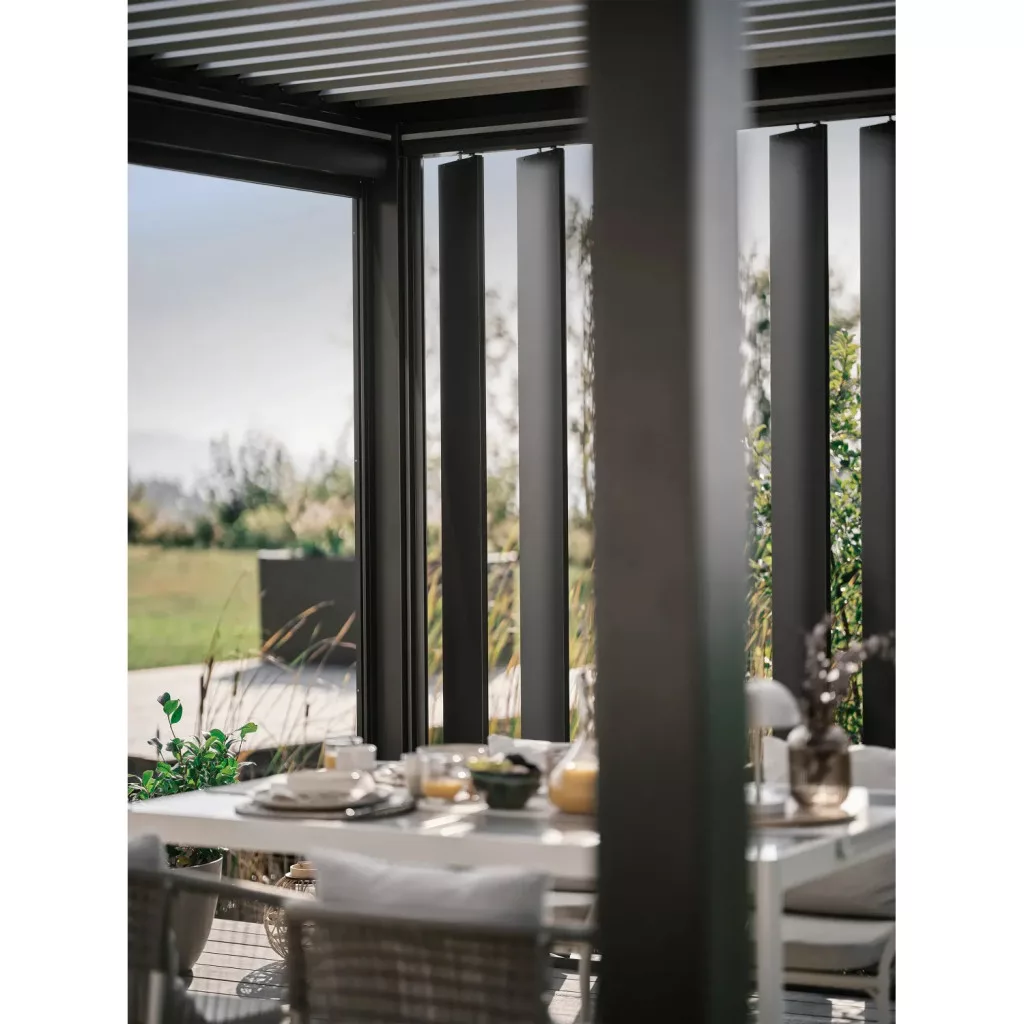 A 130°-ban állítható lamellák biztosítják az optimális komfortot, miközben a szendvicsszerkezetű kialakítás csökkenti a hőterhelést és a zajszintet. Az integrált vízelvezető rendszer gondoskodik az esővíz diszkrét elvezetéséről, így rossz időben is használható marad a pergola.