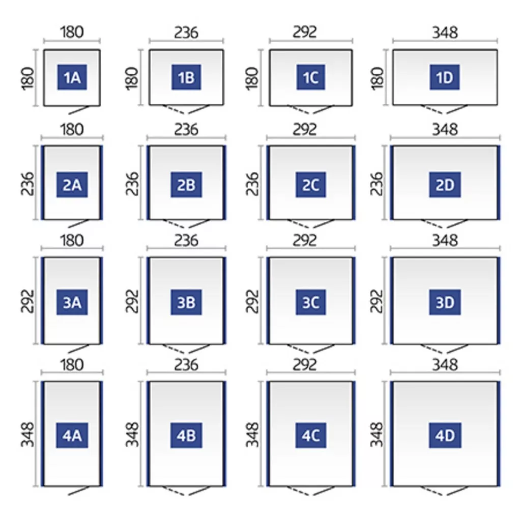 kb. 180 × 180 cm – 348 × 348 cm alapterület között több méretváltozatban.