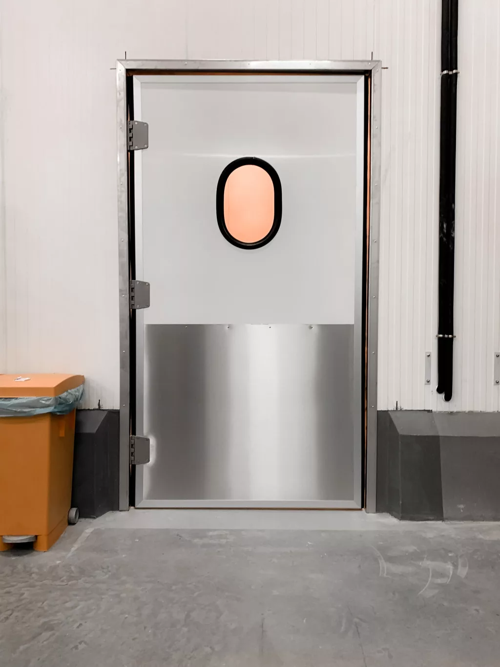 Ez a kiváló minőségű lengőajtó ideális választás ipari, élelmiszeripari vagy nagyforgalmú közösségi terek számára, ahol elengedhetetlen a gyors, kényelmes és biztonságos átjárás. A termék alap kivitelben 900 × 2100 mm-es beépítési nyílás lefedésére alkalmas, de igény szerint egyedi méretben is rendelhető, így tökéletesen alkalmazkodik a helyszíni adottságokhoz.