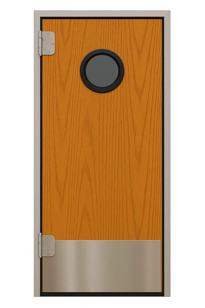 Az alap felszereltség mellett, lehetőség van az ajtólap rugdosó lemezzel való bővítésére, mely megóvja az ajtót az áthaladáskor bekövetkezhető sérülésektől, így akár lábbal vagy tároló kocsik áttolásával is lehetséges a nyítás. Rugdosólemezeink szálcsiszolt rozsdamentes lemezből készülnek.