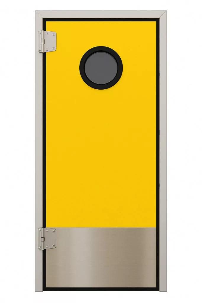 Az ajtólap két oldalt szürke színű stadurlapból áll, szélein alumínium keretprofillal, mely lehetővé teszi az oldalsó gumitömítés elhelyezését a megfelelő záródás érdekében. A zsanérok lehetővé teszik az ajtó mindkét irányból történő nyitását, és 90º -ban történő kitámasztását, ezzel könnyítve az átjárhatóságot. A műanyag borítású acél rugós zsanérok alkalmasak élelmiszeripari használatra is. Az ajtó az áthaladás után visszazáródik mindenféle kézmozdulat nélkül.