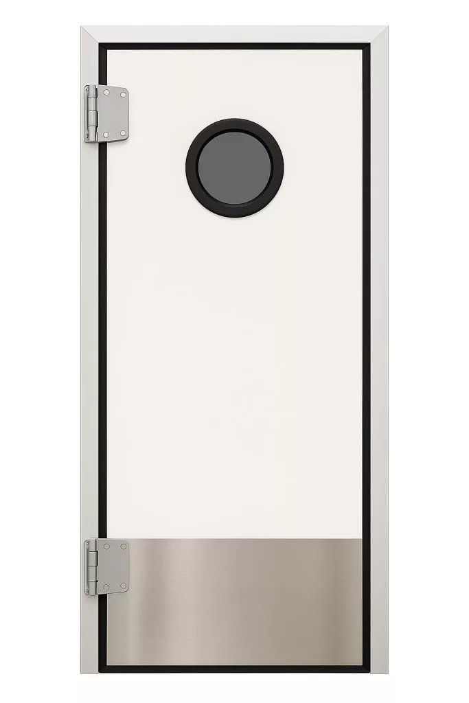 Az ajtólap két oldalt szürke színű stadurlapból áll, szélein alumínium keretprofillal, mely lehetővé teszi az oldalsó gumitömítés elhelyezését a megfelelő záródás érdekében. A zsanérok lehetővé teszik az ajtó mindkét irányból történő nyitását, és 90º -ban történő kitámasztását, ezzel könnyítve az átjárhatóságot. A műanyag borítású acél rugós zsanérok alkalmasak élelmiszeripari használatra is. Az ajtó az áthaladás után visszazáródik mindenféle kézmozdulat nélkül.