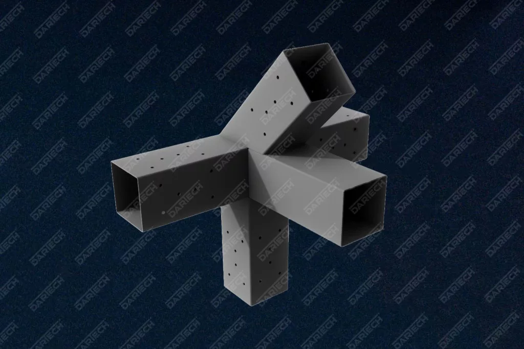 Az elemek 2 mm vastagságú acéllemezből készülnek, amelyet fekete porfestett bevonattal láttak el a maximális tartósság és korrózióvédelem érdekében. A csatlakozók belső mérete 94 × 94 mm, így ideális 100 × 100 mm-es (10 × 10 cm-es) gerendákhoz, figyelembe véve a gyalulás utáni méretcsökkenést.